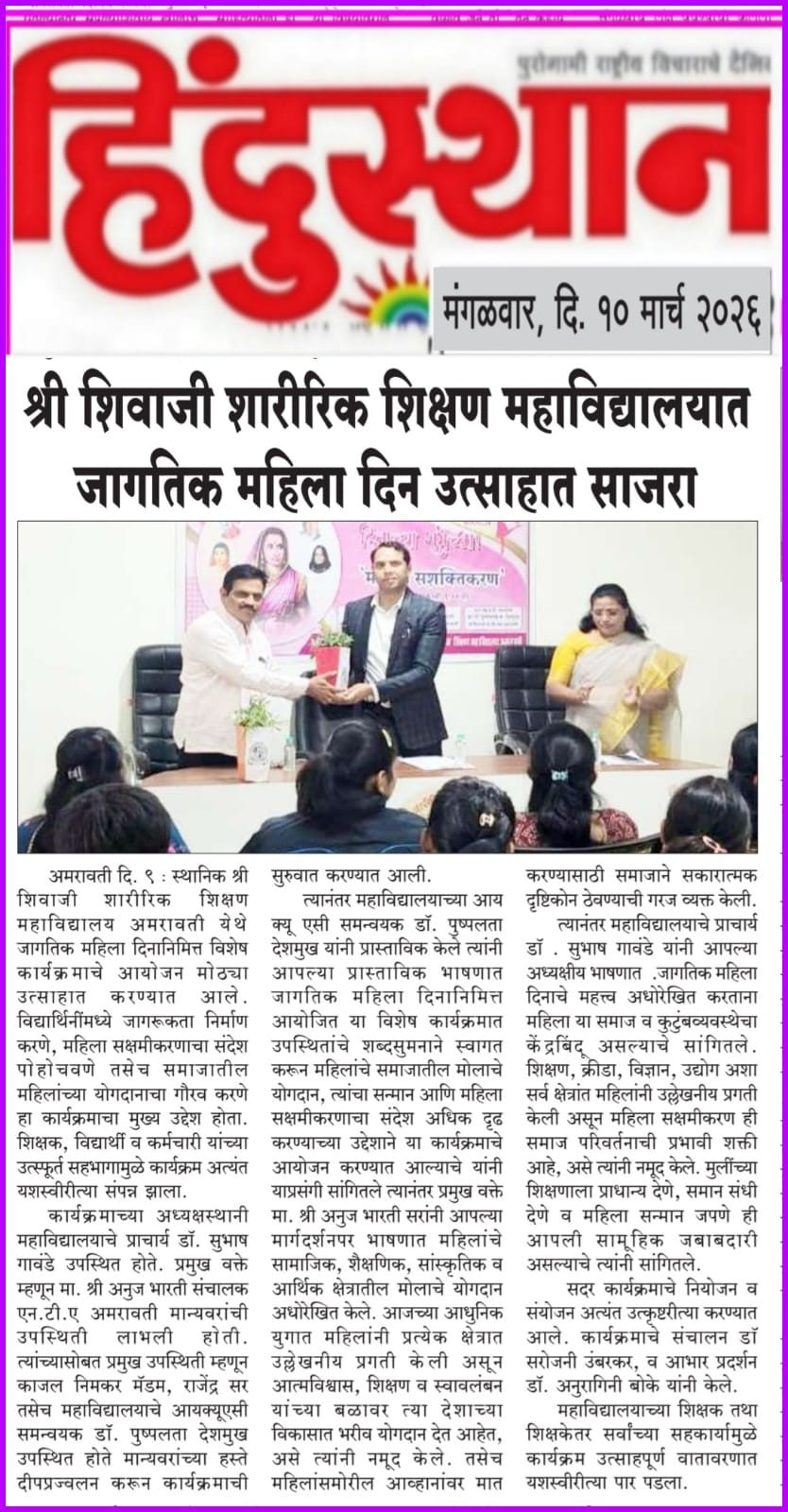 श्री. शिवाजी शारीरिक शिक्षण महाविद्यालयात जागतिक महिला दिन उत्साहात साजरा