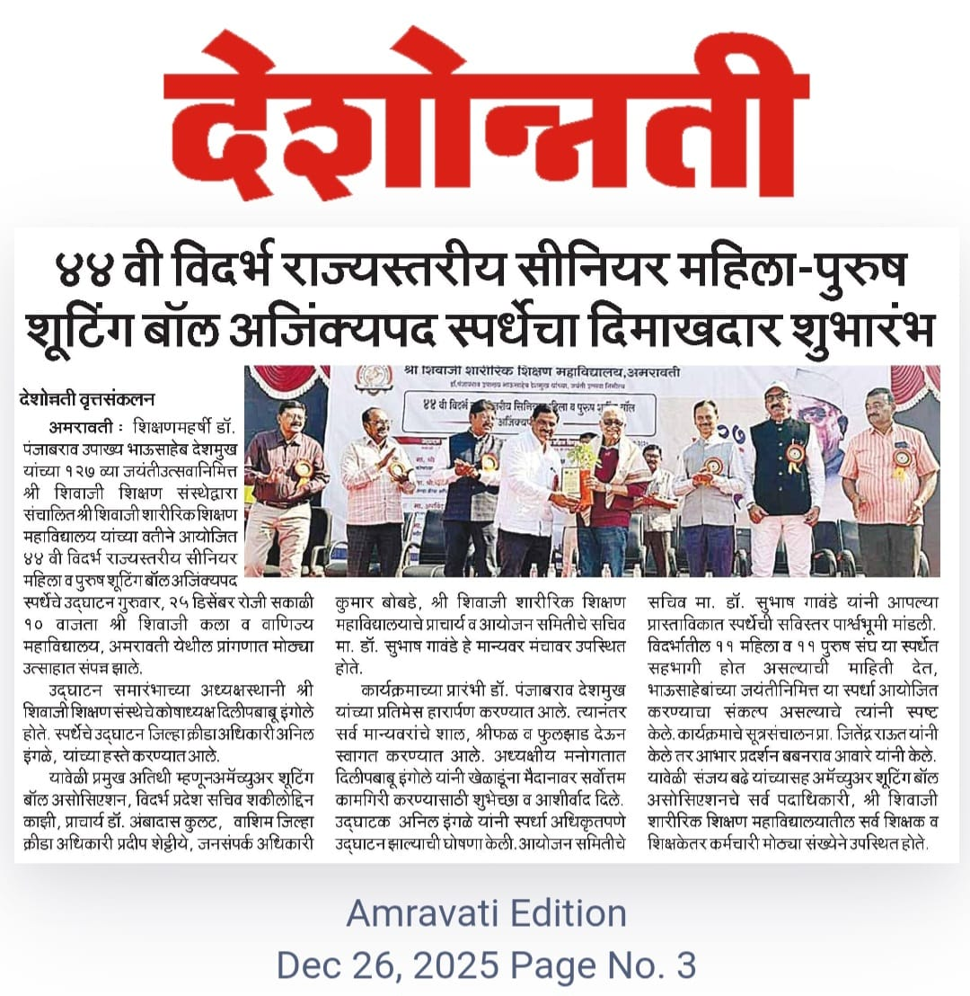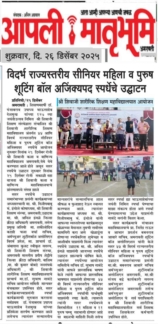 श्री शिवाजी शिक्षण संस्थेद्वारा संचालित श्री शिवाजी शारीरिक शिक्षण महाविद्यालय अंतर्गत ४४ वी विदर्भ राज्यस्तरीय सिनियर महिला व पुरुष शूटिंग बॉल अजिंक्यपद स्पर्धेचे उद्धघाटन संपन्न