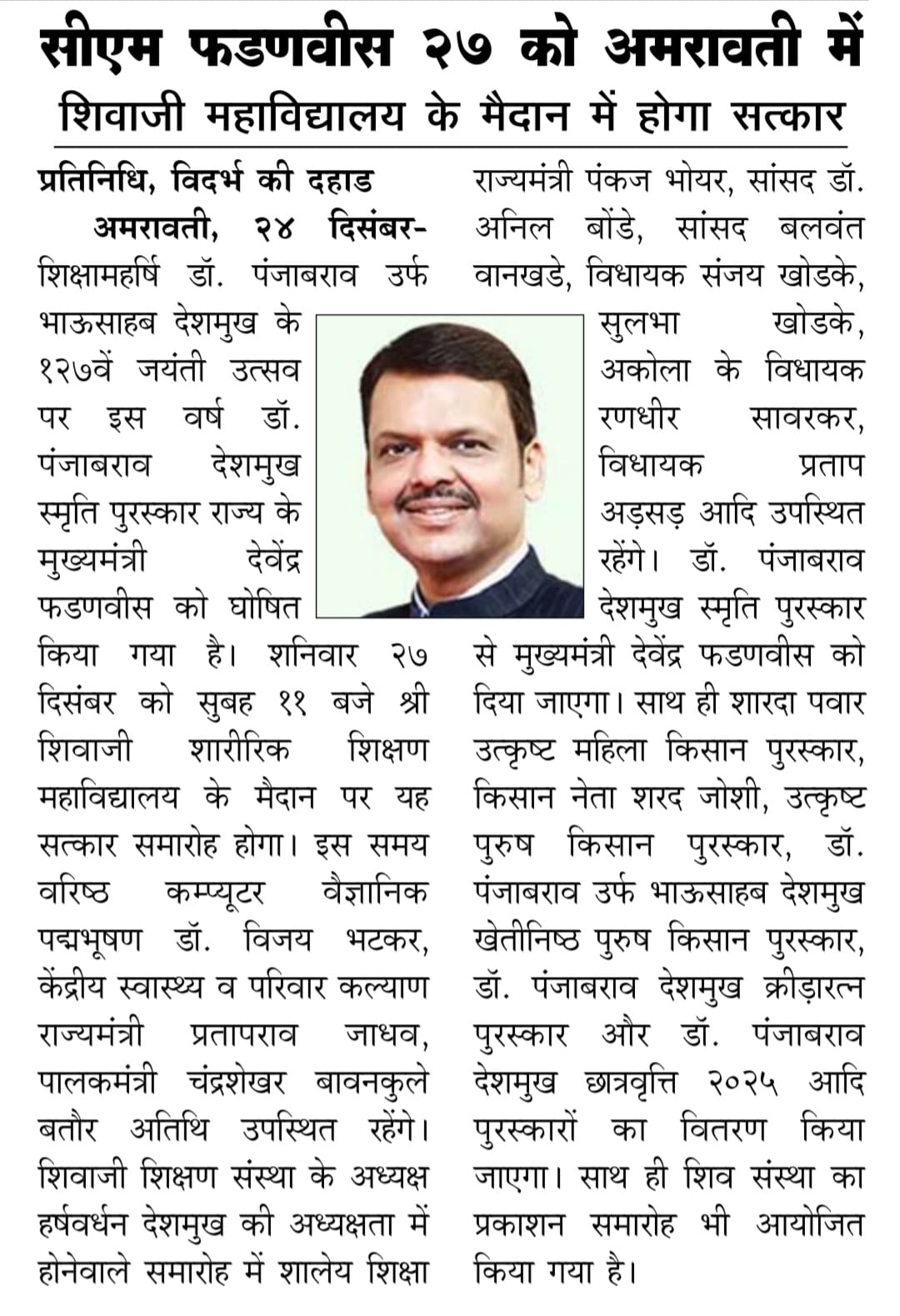 सीएम फडणवीस २७ को अमरावती में शिवाजी महाविद्यालय के मैदान में होगा सत्कार