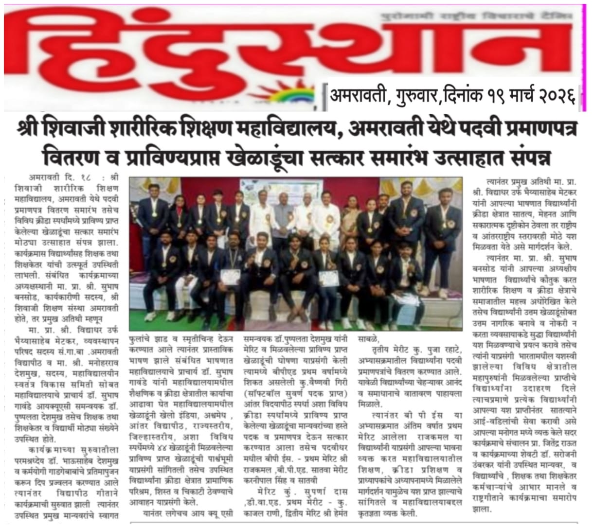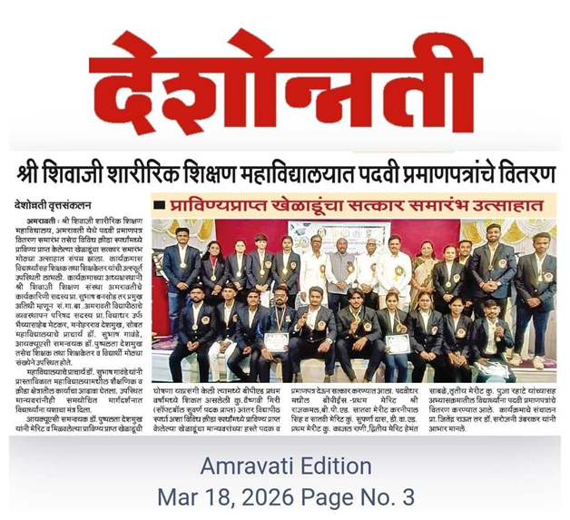 श्री शिवाजी शारीरिक शिक्षण महाविद्यालय, अमरावती येथे पदवी प्रमाणपत्र वितरण व प्रावीण्यप्राप्त खेळाडूंच्या सत्कार समारंभ उत्साहात संपन्न